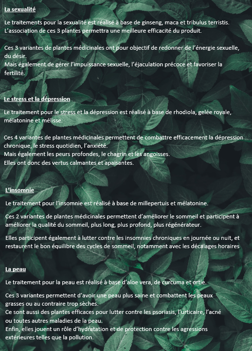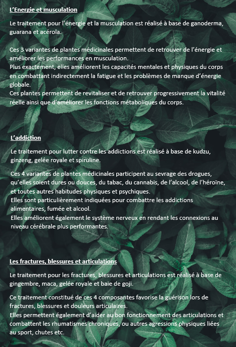 Ce traitement est réalisé à base de gingembre, maca, gelée royale et baie de goji qui ensemble vont favoriser la guérison lors de fractures, blessures et/ou douleurs articulaire.